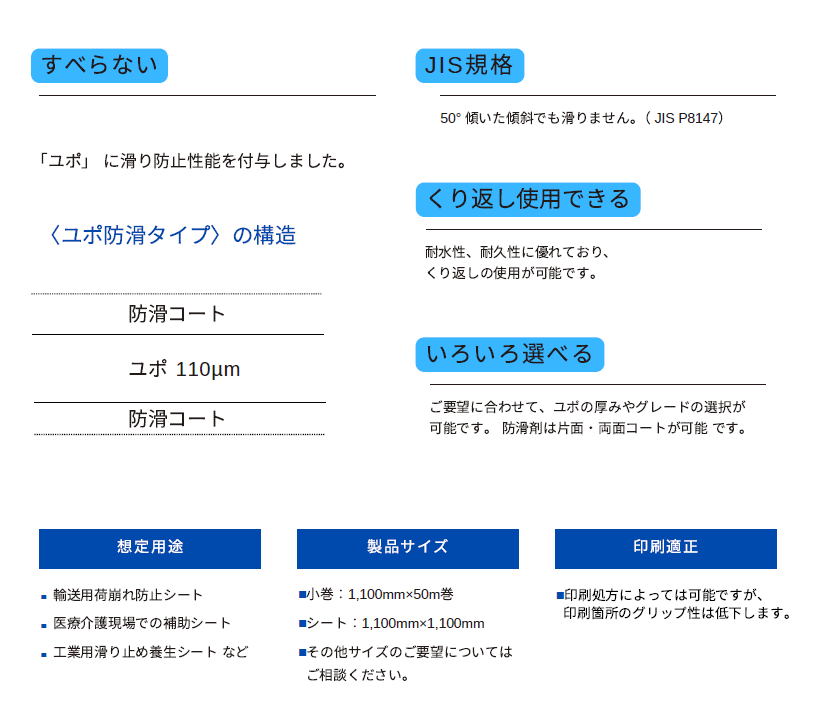 小巻:1,100×50m巻 シート:1,100mm×1,100mm防滑剤は両面・片面タイプがございます
